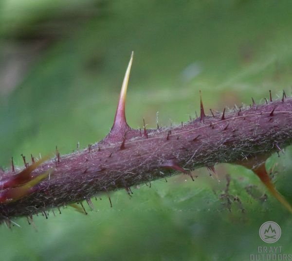 Leaves - Oval with jagged edges. In groups of 5 or 7. Fruit - Blackberries!! The immature fruit starts green and turns red to black as it matures. Flowers - Red or white. 5 petteled, a couple centimeters across. Stems - Can vary in size from 1m up to a few centimeters. Full of thorns and prickles. Size - They can grow up to 2m and cover large areas of ground.